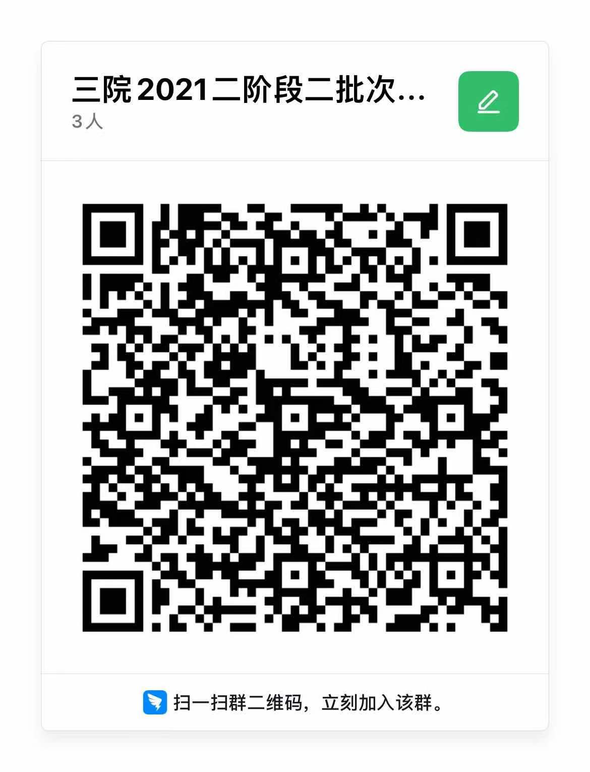 请在我院调剂批次复试名单中的考生,下载钉钉APP,实名注册认证,扫描以下钉钉二维码加入我院2021年调剂批次复试群。入群备注:考生编号-姓名,该群会有相关通知及问题答疑,请及时关注。