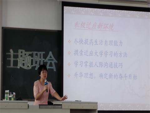 罗老师首先发言.她从大学生活变化的特点以及如何适应新环境变化等方面展开讲述。罗老师提出,大学生活变化主要表现在生活环境、学习状况、人际关系、管理制度等方面。面对这些变化,她要求同学们积极适应新的环境,要尽快提高生活自理能力、摸索适应大学学习的方法、学习掌握人际沟通技巧、升华个人理想并确定新的奋斗目标等。接着,同学就相关问题积极提问,罗老师都耐心一一为同学们给予解答,并鼓励大家在学习的同时要多参与学生社会实践活动,全面提高个人综合素质。