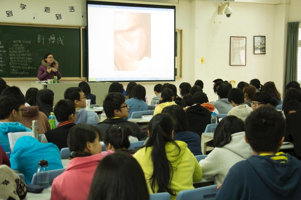 课堂上,唐教授详细讲解了舌的组织结构、舌与脏腑经络的关系等。唐教授生动幽默的语言,逼真形象的比喻让同学们对晦涩难懂的诊断理论有了深刻的认识和理解,课堂上传来一阵阵笑声。简部长坐在后排的座位上也听的津津有味,并认真做着记录。