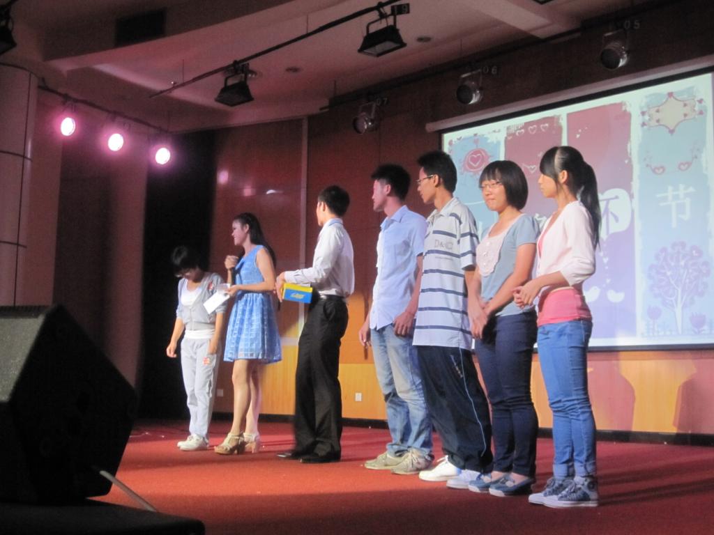 晚上7:00,在炫彩转动的舞灯映衬下,主持人宣布晚会正式开始。其中有优美动听、令人沉浸在其中的悠远的歌声;充满激情与活力,引爆全场的舞蹈,穿插在节目之间的游戏与抽奖环节更是让现场高潮迭起。晚会以13级新生表演的小品《爱的领悟》作为压轴节目,此节目把新生的表演才能发挥的淋漓尽致,张扬不羁的服饰、搞笑的表情和夸张的动作,展现出了他们的个性和青春,给观众留下了深刻的印象,台下时时传来雷鸣般的掌声。