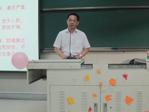 程英雄老师作为教师代表发表了讲话,他希望同学们能耐得住寂寞,潜心求学。刘羽茜同学作为新生代表满怀深情的表达了对中医学的热爱,并表示要努力过好自己的大学生活。 接着,在2013级兼职辅导员邓茂鑫老师的引领下,全场师生在庄严的气氛中进行了医学生誓词的宣誓。“健康所系,性命相托。当我步入神圣医学学府的时刻,谨庄严宣誓……”的声音久久回荡在课室的上空。