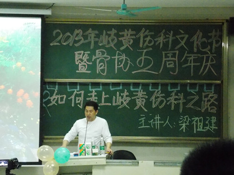 2013年4月24日晚上7点,由167net必赢入口骨伤科学研究协会主办的岐黄伤科文化节暨骨协五周年庆系列讲座之“如何走上岐黄骨伤之路”在大学城综合楼202隆重举行。本次讲座邀请了第三附属医院副主任医师——梁祖建副教授担任主讲,出席本次讲座的还有来自不同协会的特邀嘉宾和各学院的同学们。