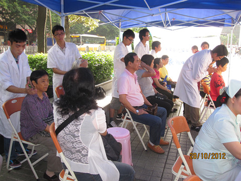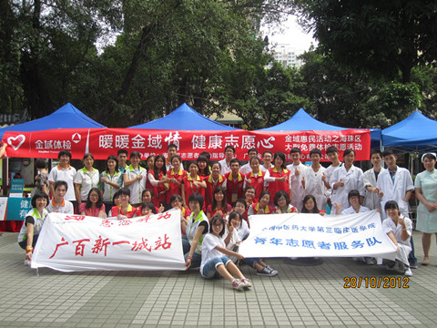 2012年10月28日,三院青年志愿者服务队19名学生志愿者来到海珠区江南西广百新一城广场,为社区居民开展健康咨询服务。