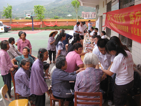 服务团由三支队伍组成,分别为:医疗卫生服务队、流行性疾病防治宣讲队和“新时期广东精神”寻访采风队。活动的主要任务是深入当地农村,为村民送医送药,提供医疗保健服务,对流行性疾病和中医养生保健知识进行宣讲,并就“新时期广东精神”开展社会调查问卷活动。队伍来到从化市温泉镇桃莲村和中田村开展义诊赠药服务。内科、外科、妇科、儿科和骨科多位医生和研究生认真地为患者检查,提供诊断和开出药方。村民求医问病、医生认真地为村民检查、开处方,同学们热情地做好后勤服务,形成了一道亮丽的风景。考虑到村中有病患行动不便,队伍除了定点义诊外,还将安排几位医护人员采取入户的方式为多家特困农户进行诊疗,确保困难村民都能享受我们为他们提供的服务,让他们感受到浓浓的爱!