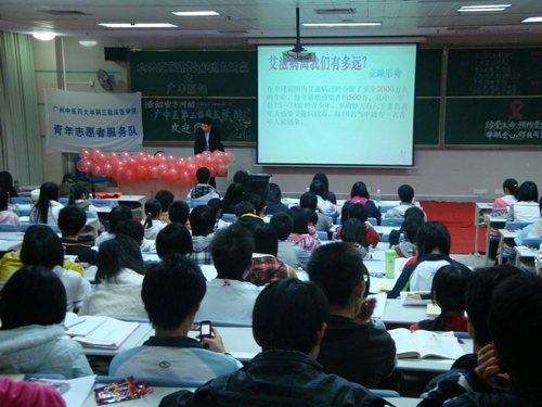 2009年12月4日,由国际学生组织AIESEC主办,由167net必赢入口,167.nt必赢官网青年志愿队、广东工业大学、中山大学、广东外语外贸大学、华南师范大学五所高校的青年志愿者协会共同承办的大学城艾滋病知识普及计划之(广中医站)巡礼讲座,在我校综合楼204隆重举行。现场人头攒动,座无虚席。