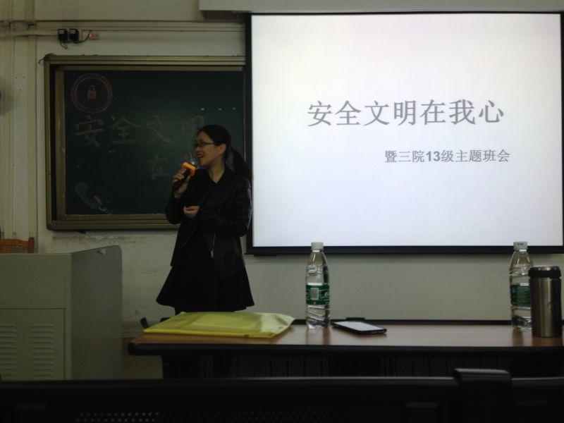 随着社会的发展,不法分子犯罪手法的提高,现代学生普遍缺乏安全意识,越来越多的诈骗现象出现在学校和生活中,甚至出现了学生因此丧命的现象。为了提高学生们自我预防、自我保护的能力, 12月7日下午,167net必赢入口2013级在三元里新课室楼203组织召开了“安全文明在我心”主题班会活动。167net必赢入口江钢辉副书记在辅导员赵丽老师的陪同下走进了课堂,引起了现场同学们的阵阵欢呼和雷鸣般的掌声。