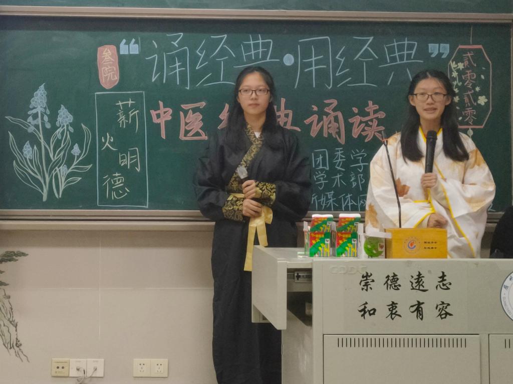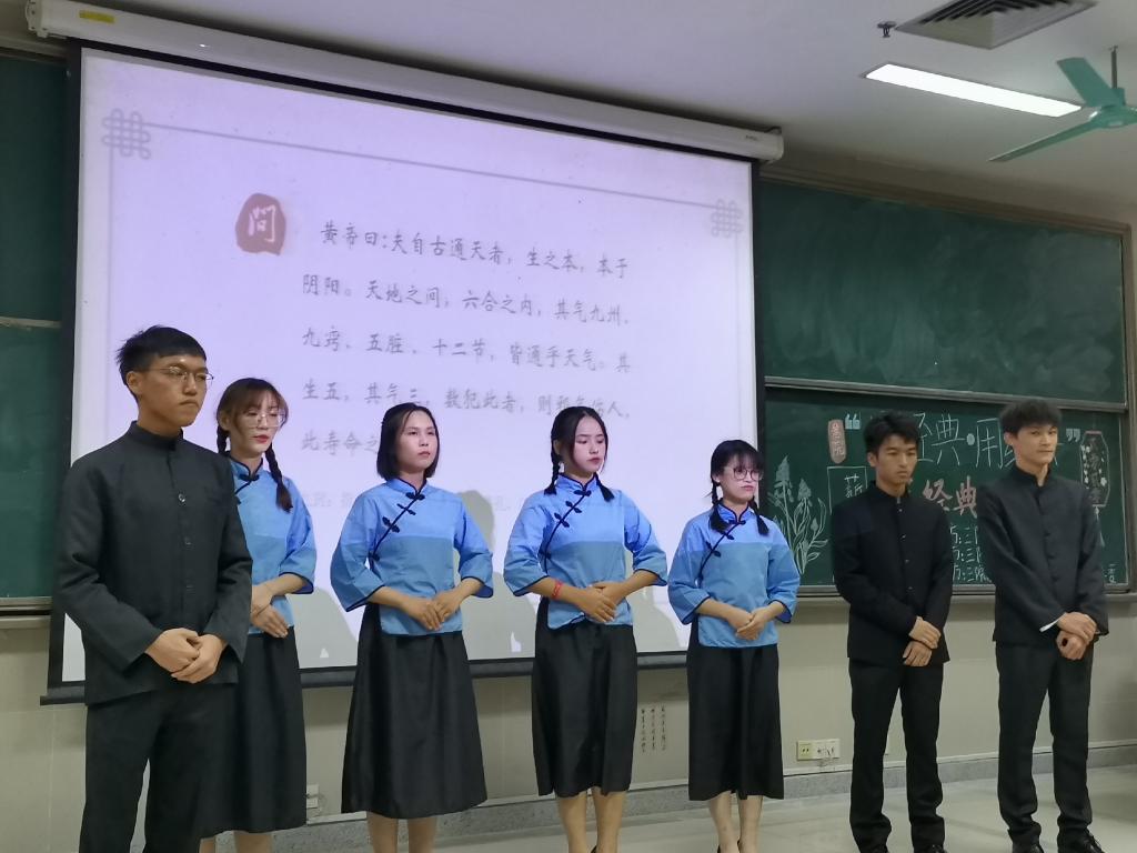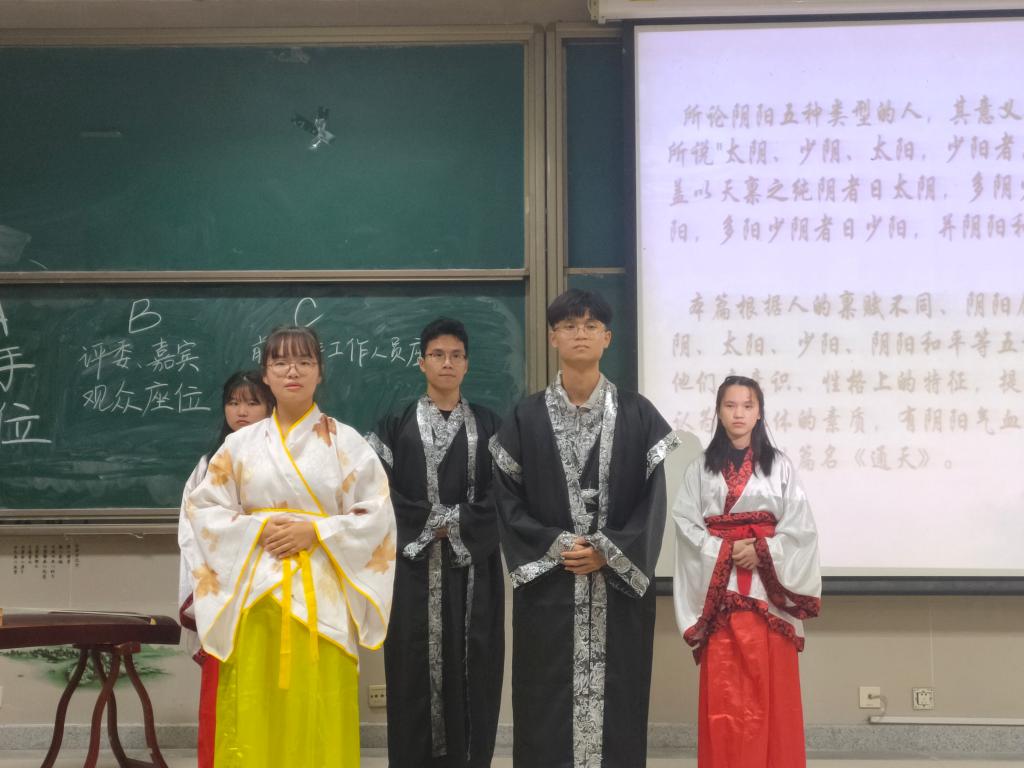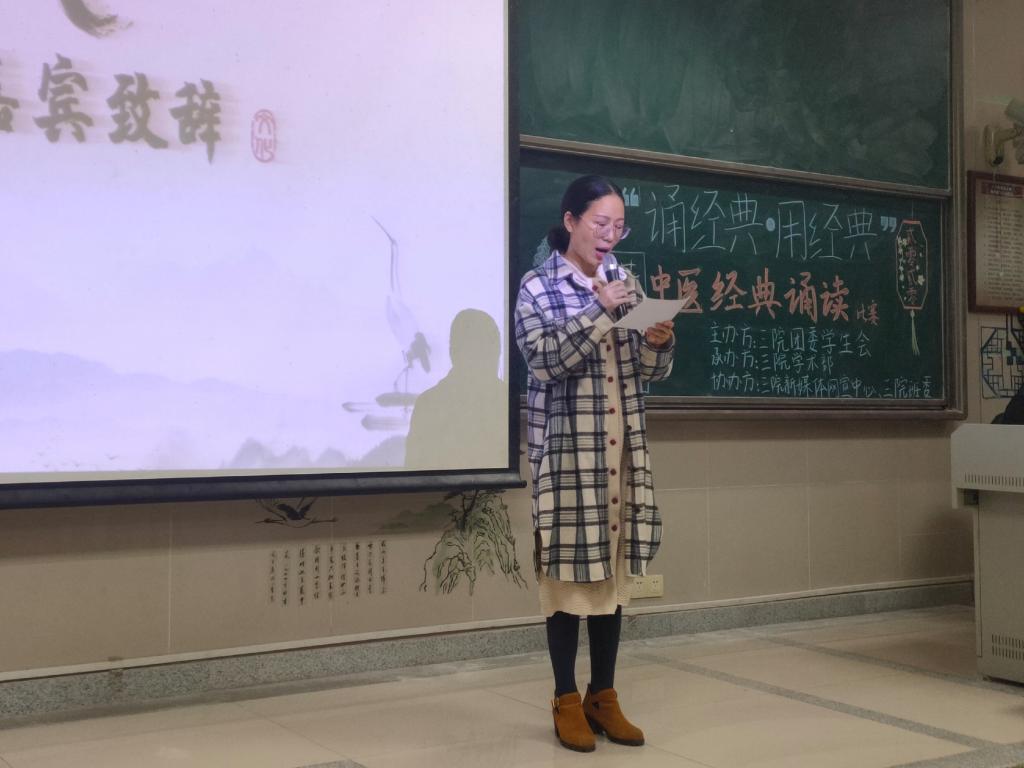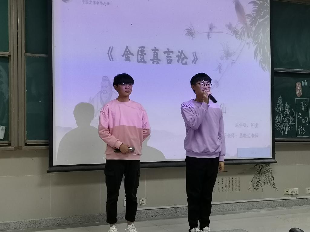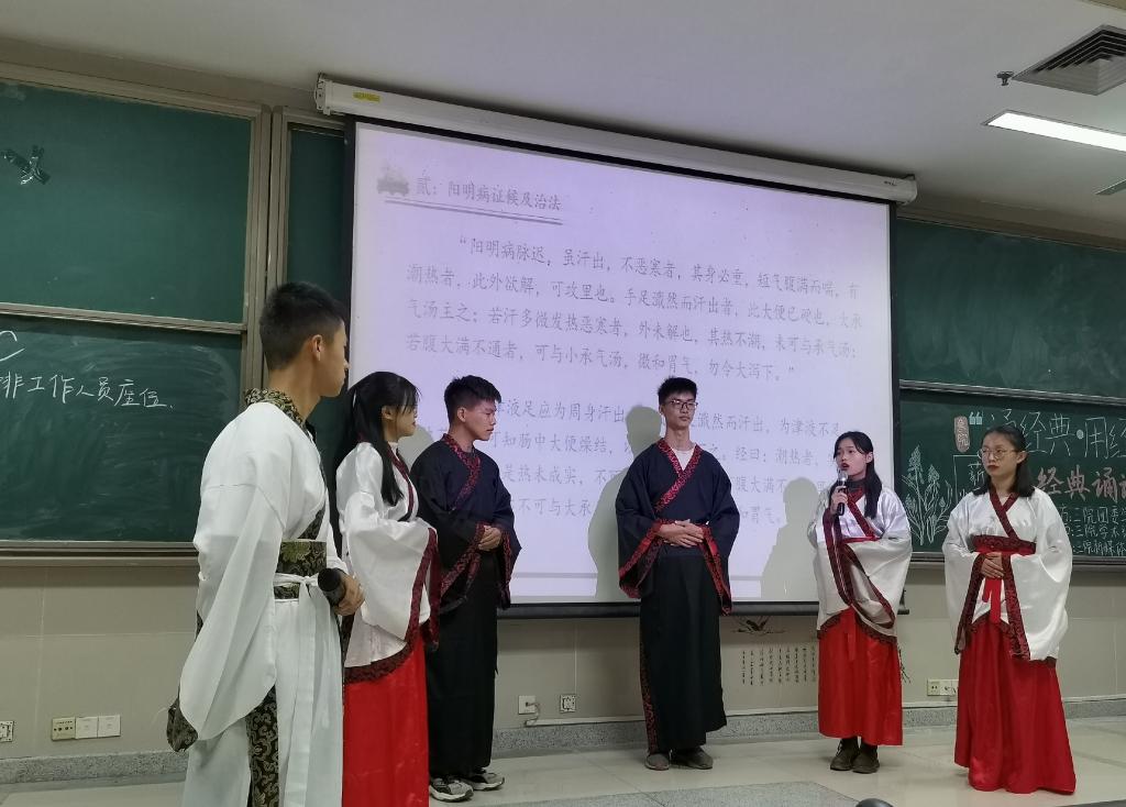 在主持人介绍完在场评委嘉宾后,比赛正式开始,本场比赛由三院19、20级的同学自由组队,最后一共有12个小组参与本次比赛。不同的小组分别截取了《黄帝内经》、《金匮要略》等书籍的经典片段,他们用自己的声音表达出了对经典的理解,用情感表达出了中医经典的文化魅力,把神圣的中医经典展现得淋漓尽致。