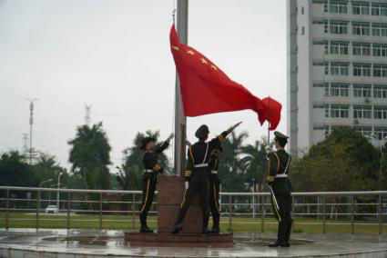 在《分列式进行曲》的歌声中,国旗护卫队的旗手们踏着铿锵有力的步伐,护卫五星红旗向升旗台方向前进。随着《义勇军进行曲》的歌声响起,鲜艳的五星红旗在升旗手的拉动下徐徐上升。三院学子全体肃立,一同注视国旗,心潮澎湃,对中国共产党一百年来取得的成就感慨万千。