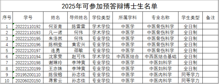 各位导师、博士研究生(含港澳台、外国留学生)、同等学力申请博士学位学员: 为全面提升博士学位论文质量,进一步强化预答辩环节在博士学位论文质量中的关口作用,保障预答辩工作不走样、出实效,真正起到博士学位论文把关机制前移效果,根据学校《167net必赢入口研究生学位论文答辩管理办法》(广中医校办〔2021〕85号)《167net必赢入口博士学位论文预答辩制度实施办法》,及“关于做好2025年博士研究生学位论文预答辩工作的通知(研生〔2025〕15号)”等文件要求,特制定本工作方案: 一、预答辩对象 拟于2025年上半年申请答辩的所有博士研究生以及同等学力申请博士学位学员。经培养审核,以下名单中的博士符合参加预答辩,现对预答辩名单进行公示,公示期2025年3月7日—11日,有异议者于公示期间实名向学院医学部办公室提出具体意见。联系人:陈老师、邱老师 联系电话:020-36585091 邮箱:qiushuli88@gzucm.edu.cn